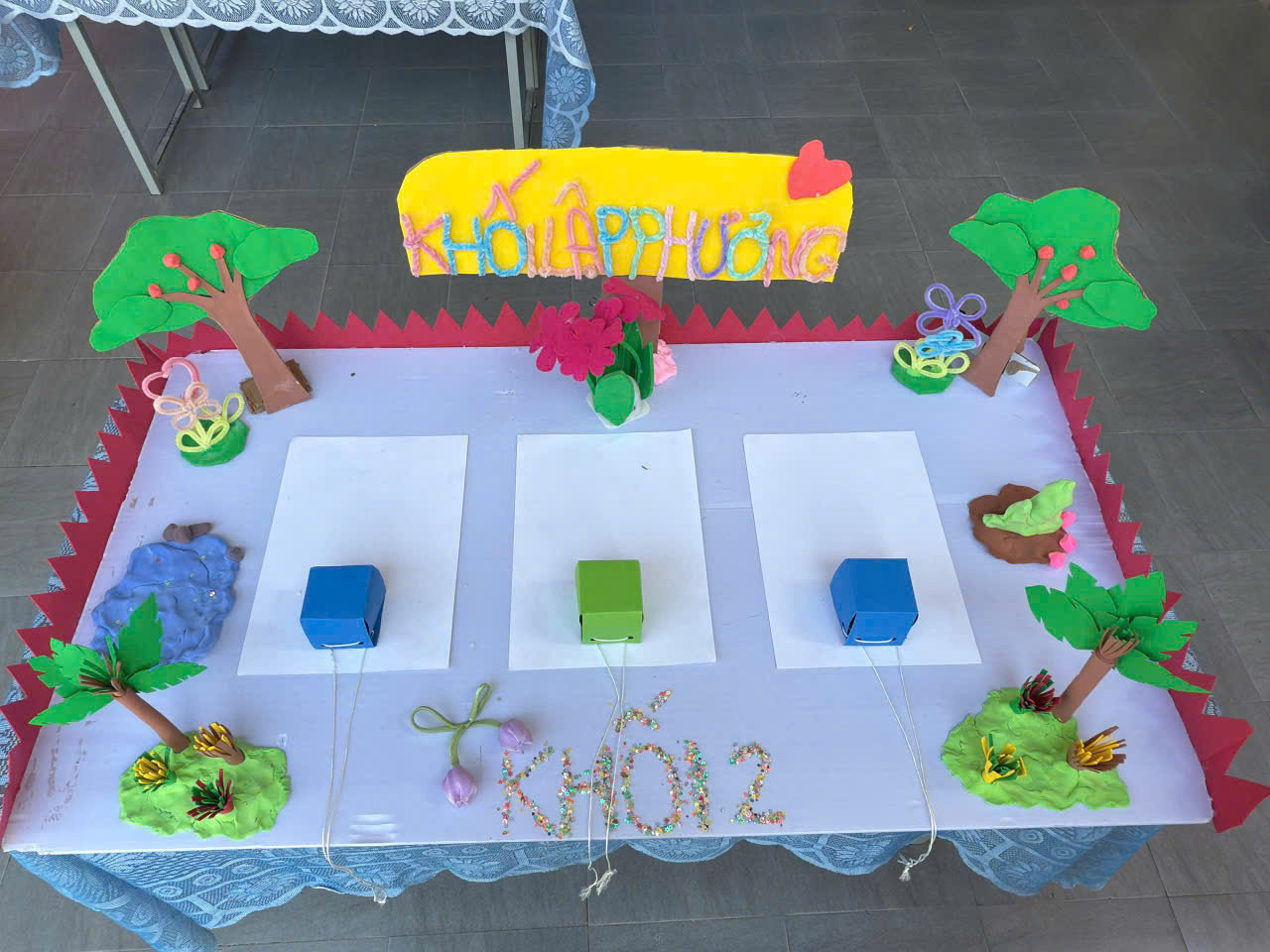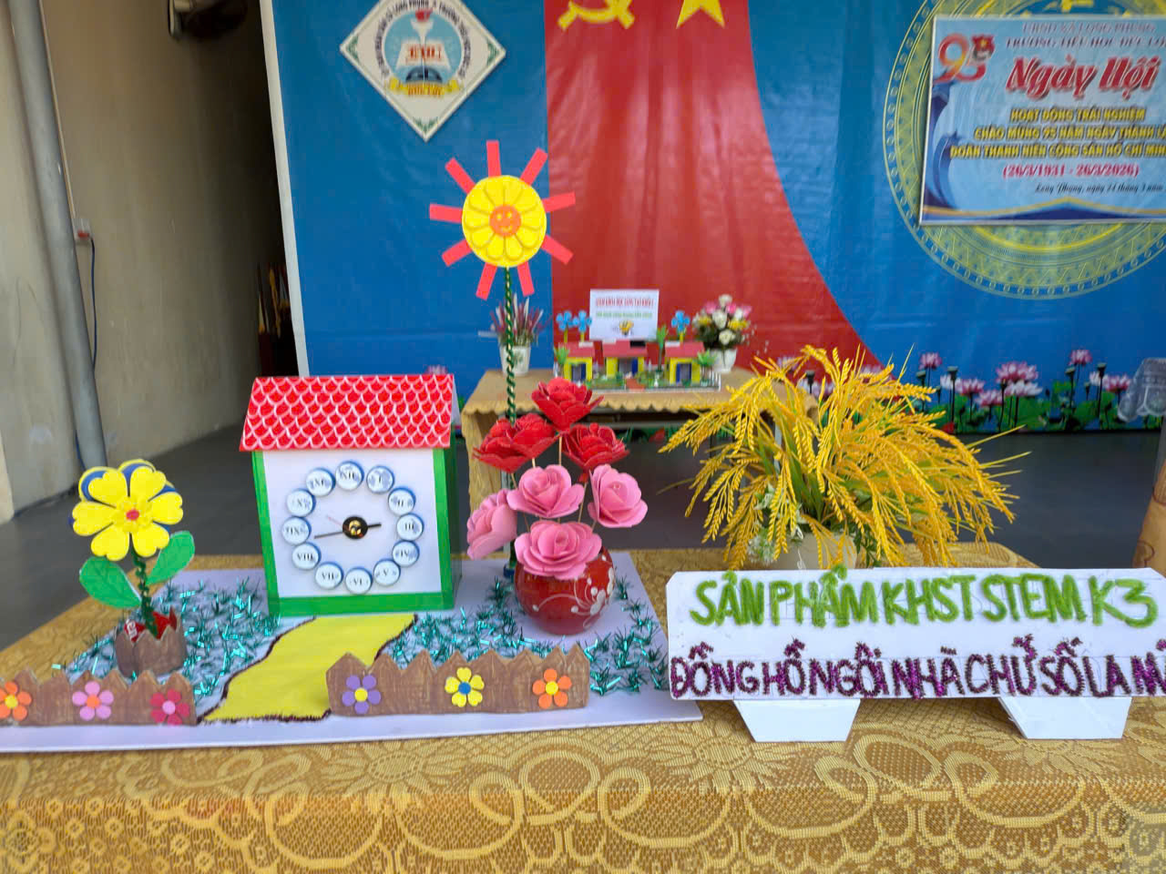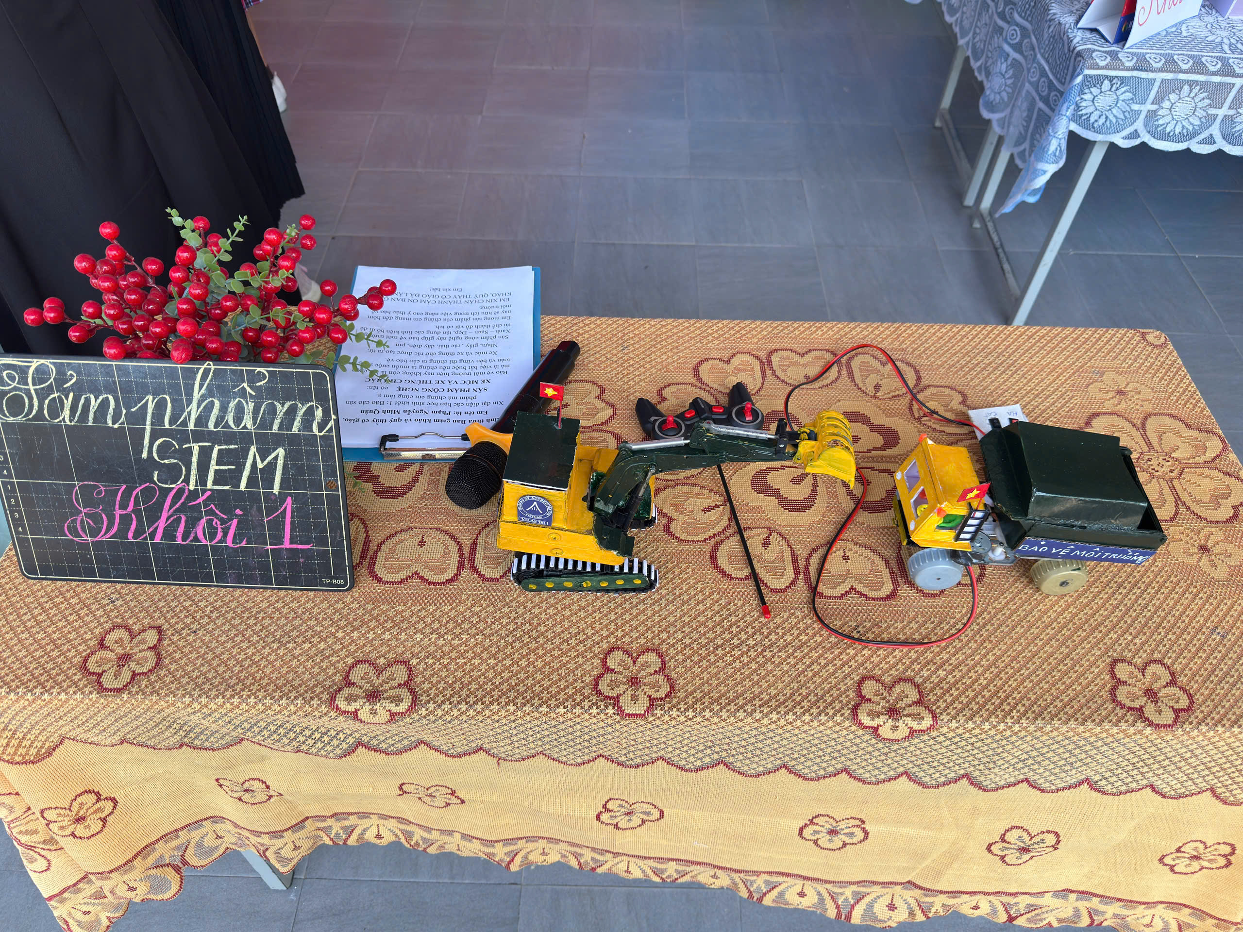 Giao lưu CLB Stem: với rất nhiều sản phẩm được trưng bày trong ngày hội: xe múc và xe thùng chở rác, tạo mô hình khối lập phương, đồng hồ ngôi nhà số La Mã, rạp chiếu bóng mini, mô hình năng lượng bền vững.